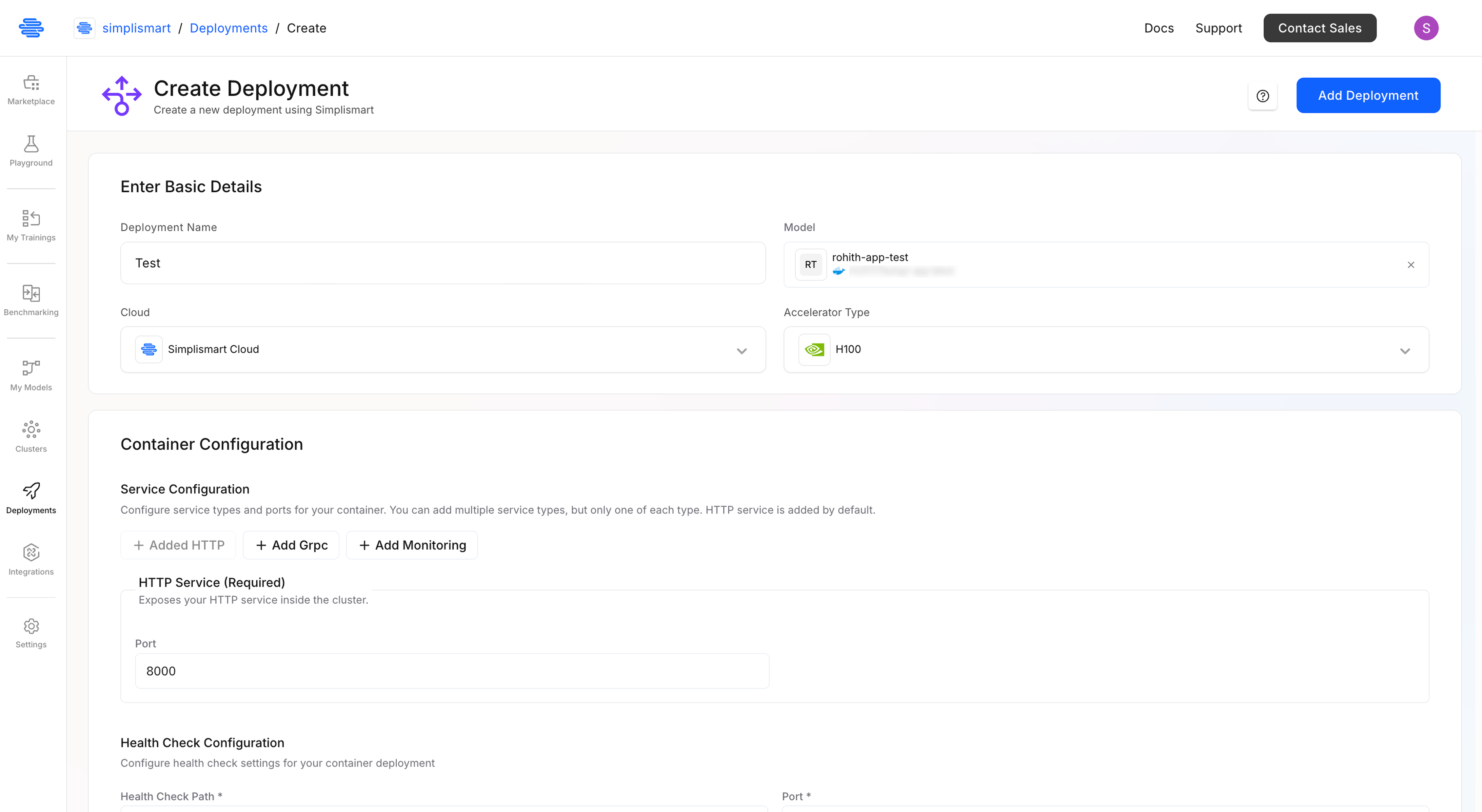 - Cloud: Select Simplismart-Cloud as the cluster for private deployments.